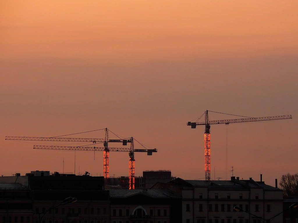 Это не специальная подсветка. Это заходящее солнце так отражается от металлических конструкций. Честное слово! Я и сам поразился.