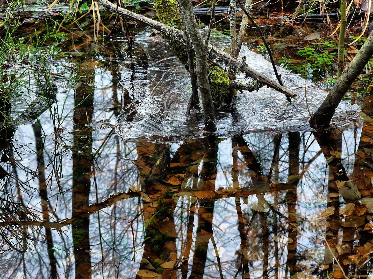 Последние два дня по ночам были заморозки, и на открытой поверхности воды успела образоваться небольшая корочка льда. Правда, быстрое течение пока ещё не дает поверхности ручья замерзнуть целиком.