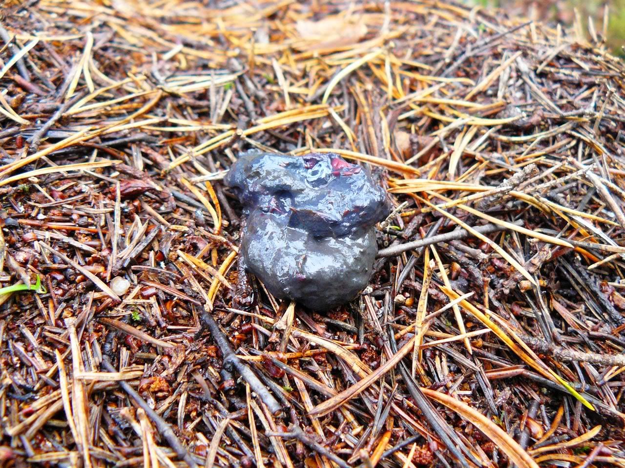 Я не стал помещать в этот пост крупный план, но всё же интересно: зверь явно небольшой, лёгкий, поскольку муравейник не повреждён, но это же надо додуматься, залезть на самую вершину муравьиной кучи, чтобы оставить там свою поменьше… На мой взгляд, это кто-то из куньих, поскольку подобное поведение очень уж похоже на поведение живущих у меня хорьков.